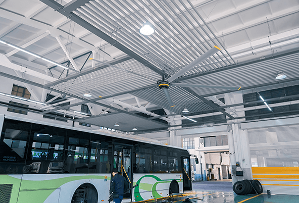Kale HVLS (High-Volume, Low-Speed) fans are an ideal solution for improving conditions in a bus station. These large-diameter fans gently move massive volumes of air, effectively destratifying the building by mixing the hot and cold air layers to create a more uniform temperature throughout the waiting area.